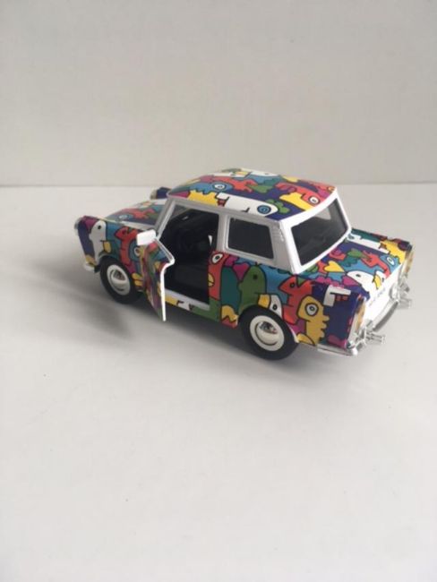 The Scale Model of the original full size Trabant Car by Thierry Noir from 1984 is a fully realistic and faithful copy of the original. This version in Colours and Black.