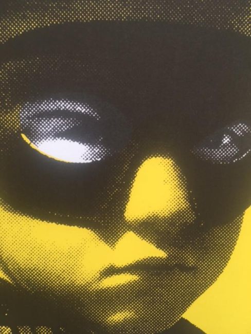 From 2012 Paul Insect’s work evolved from street graf into bright, multi-textured collages feature cropped portraits, patterned colour fields, benday dots, and decorative elements such as diamond dust and glitter.