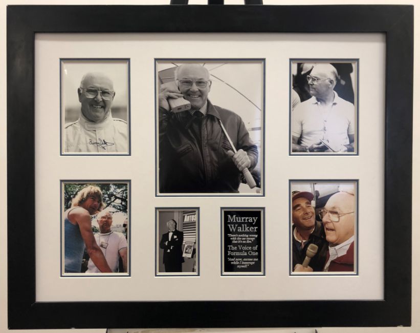 A framed and mounted presentation bearing the original signature of Murray Walker.