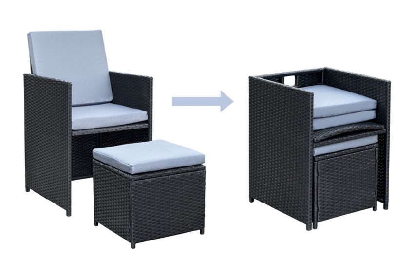 The stools and chairs have fold down backs that allows them to fit neatly underneath the table - easily store them away and maximise your space when the table is not in use.