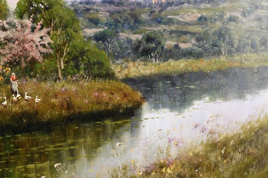 5850 - A very fine original painting on canvas (unsigned) depicting a peaceful country scene.