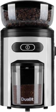 The Dualit conical coffee grinder ensures consistently ground coffee, maximizing the aroma of the beans through its unique conical burr design. With removable burrs, cleaning between bean changes is quick and easy while the large 250g hopper allows for up to 35 portions without refilling.