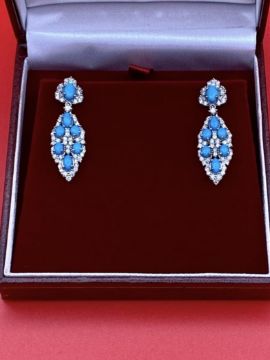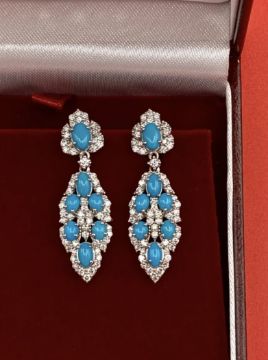 The earrings each have an oval foliate drop and surmount; with four claw-setting on each of the seven oval turquoise cabochons, which are of matched vibrant hue.