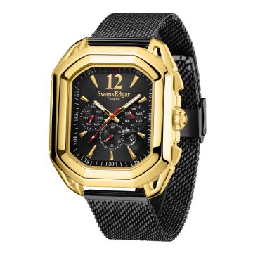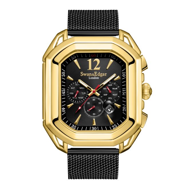 The soot-black bracelet, gold IP case, and Swan & Edgar logo engraved stainless caseback provide the finishing and elegant touches to the timepiece that radiates the perseverance and success in the face of adversity that made Wren an immortal name in British history.