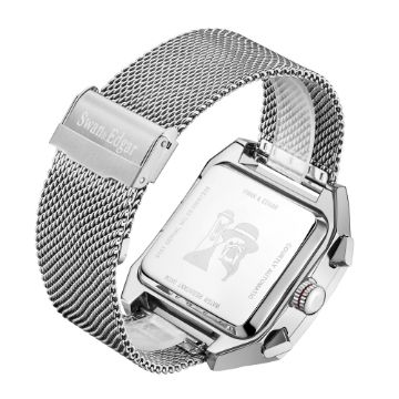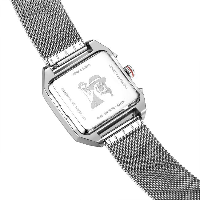 The Swan & Edgar logo engraved stainless steel caseback is complemented by a stainless steel bracelet. In addition to this, there is an interchangeable rainforest-green leather strap, providing appealing stylish options and paying tribute to the opportunities that Lord Shaftesbury spent his life advocating for.