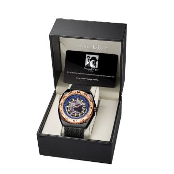 The Swan & Edgar logo engraved stainless steel caseback and midnight-black mesh bracelet secure a black IP case with a gold rotating bezel that acts as a crucial tool for travellers of the modern world who follow Mildenhall’s influence.