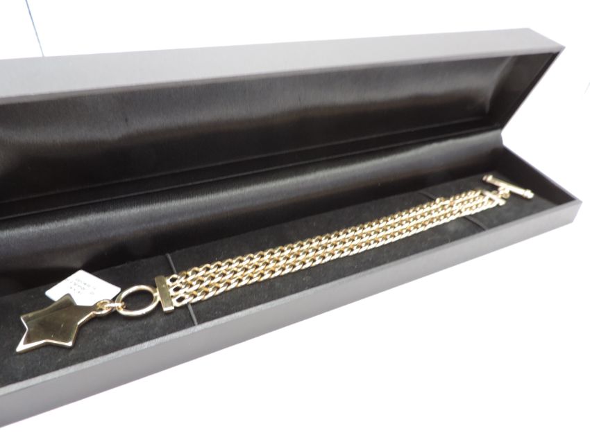 Bracelet is 20mm wide 7.5 inches long weighs 38 grams and has a toggle clasp and star charm.