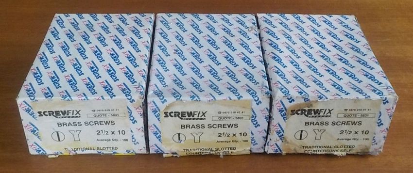 300 (3 boxes x 100) 2& 1/2" x 10 traditional brass countersunk screws, slotted head