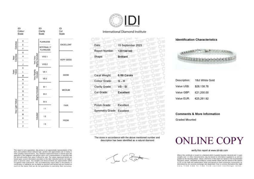 Title: 18ct White Gold Tennis Diamond Bracelet 6.89 Carats