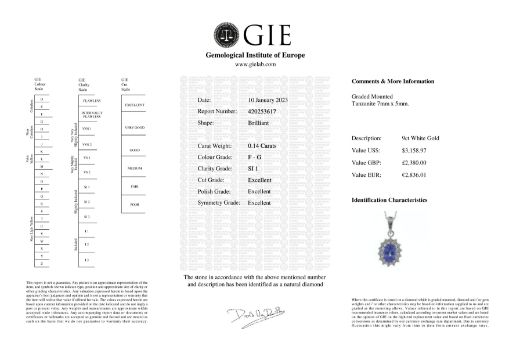 An oval tanzanite 7mm x 5mm sits in a halo of round brilliant cut diamonds to create this stunning 9ct white gold pendant.