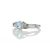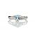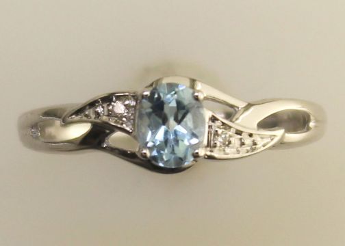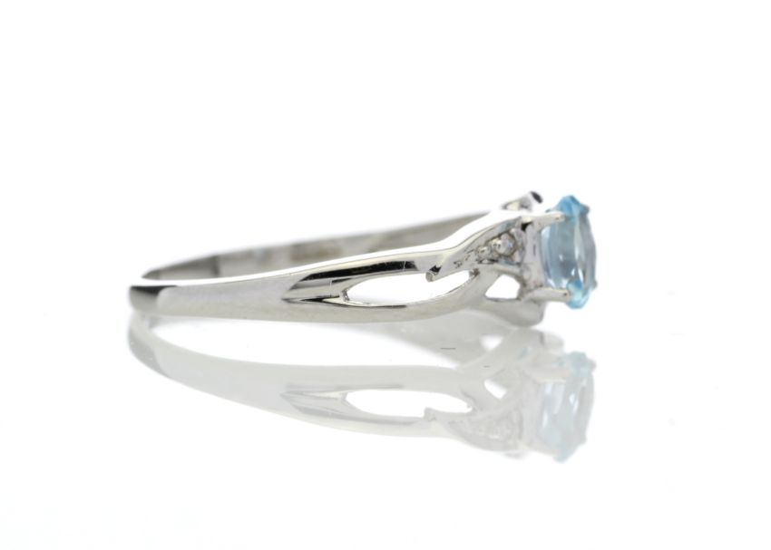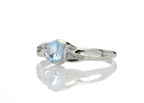 One oval blue topaz gemstone sits between two round brilliant cut diamonds on the twist shoulders.