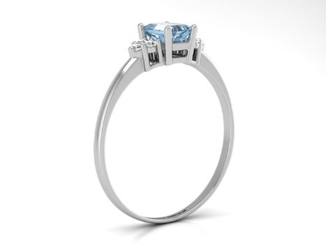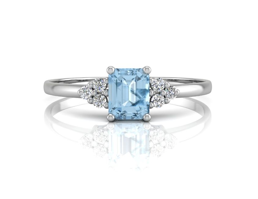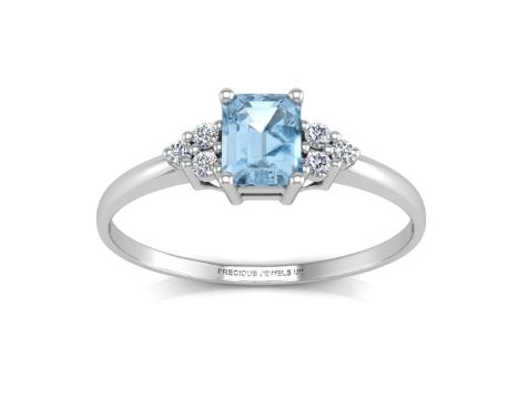 An emerald cut Blue Topaz 0.61 carats sits between six round brilliant cut diamonds in this gorgeous 9ct white gold ring.
