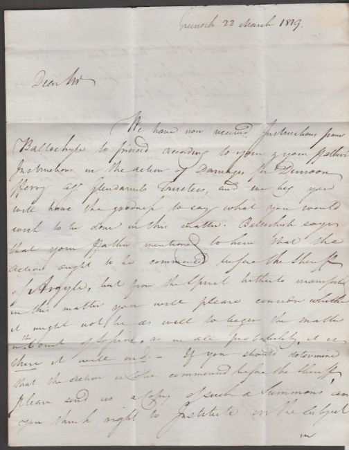 Entire letter from Greenock to Edinburgh with "GREENOCK/SHIP LETTER" handstamp applied in error, purposefully smudged and overstruck with crossed strikes of the dated Greenock mileage mark.  An extraordinary handstamp error on an inland letter.
