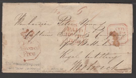 Entire letter (some staining) from Maynooth to a Bombardier in  the Royal Artillery at Woolwich, prepaid at the 1d soldiers concession rate, with scarce octagonal framed "To be / delivered / Free" in red.  The enclosed letter is actually to a 'Catherine', a clear abuse of the concession rate.