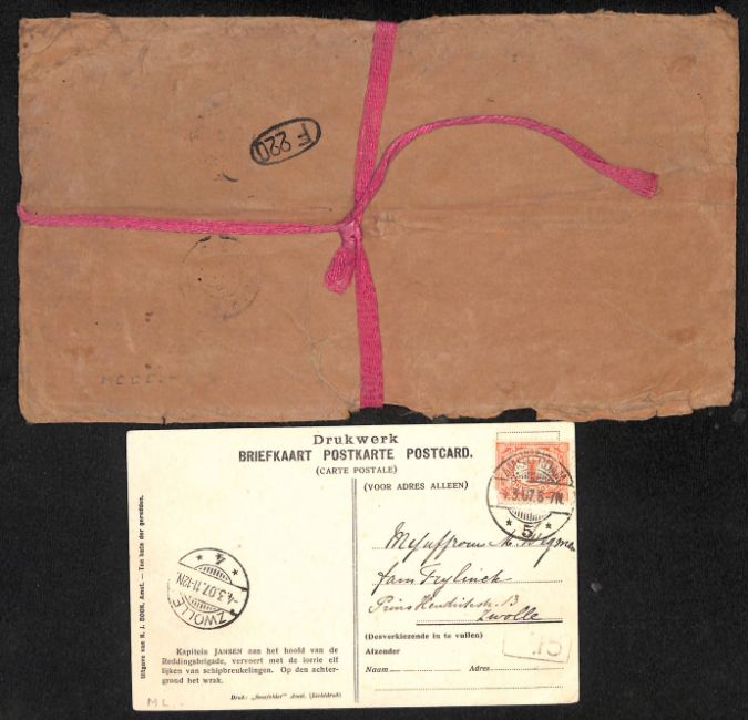 Wrapper tied with tape, headed "PATTERNS ONLY" and sent at the special 1d pattern post rate from Manchester to Amsterdam, handstamped "BESCHADIGD DOOR RAMP / HARWICH BOOT" in violet.  Recovered from the G.E.R. Steamer "Berlin" which sank off the Hook of Holland early on February 21st with the loss of 165 lives.  Also a picture postcard of the wreck.