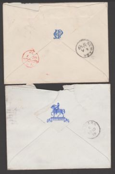 Covers from E.J Pollard, Captain of H.M.S "Rupert" (one with crest on reverse), sent from Alexandria to England by naval bag, both franked by Egypt 1pi pair cancelled in London by "FB" or "28" obliterators, one cover with a piece torn from upper edge, the other very fine.  Two unusual covers.