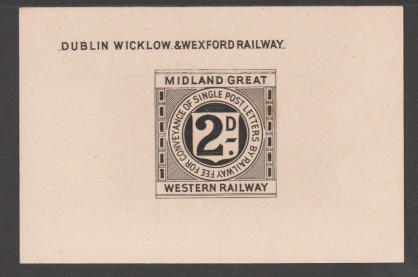 Midland Great Western Railway 2d Die Proof in black on card (9mm x 60mm) with 'Dublin Wicklow and Wexford Railway' printed above, the only example we have seen.
