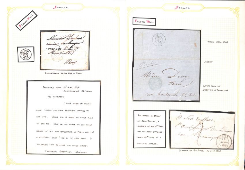 Entire letters written by political prisoners held after the 1848 revolution that resulted in the abdication of the King Louis and the proclamation of the Second Republic, sent from various prisons (11) or prison hulks in the Brest Estuary (3), all postally used. Also two associated official letters or certificates. An interesting collection on pages, ex Alan Wood collection. (16).