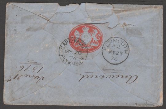 Cover (minor faults) from Devonport to "W.S Holland, Ships Corpl, H.M.S Flora, Simons Bay, Cape of Good Hope:, franked at the 1d sailors concession rate, backstamped "CAPE PACKET/PLYMOUTH" c.d.s (Rob. P3, recorded 1870-78 but rarely used).  A scarce 1d rate cover to the Cape.