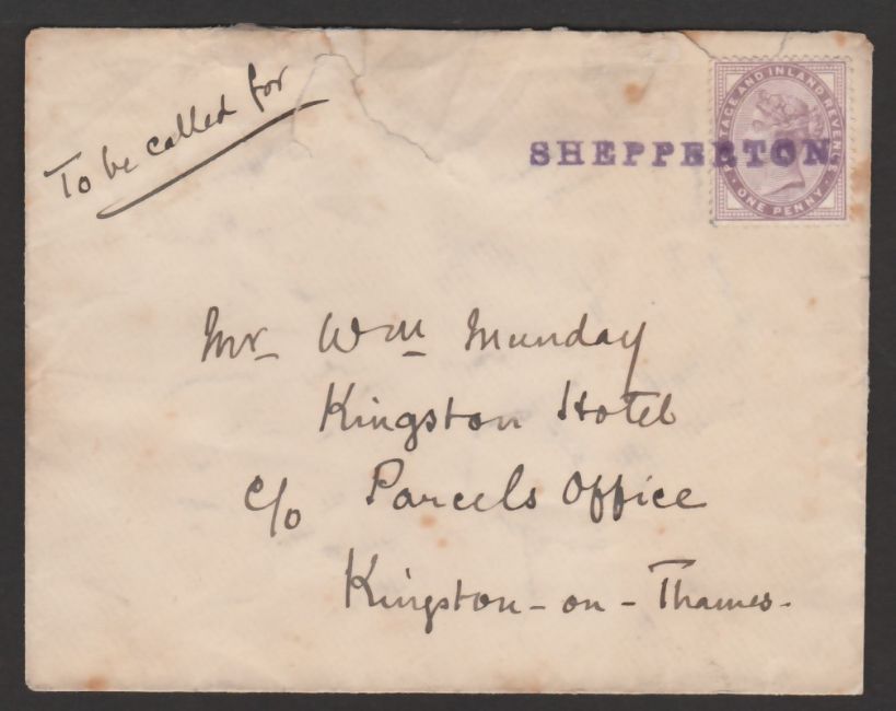 An early and interesting Railway Cover from the "London and South Western Railway", bearing an 1881 1d lilac on the front cancelled with a straight-line "SHEPPERTON" in violet, and endorsed "To be called for".  On reverse is a "London and South Western Railway" 2d stamp, perf. 14, again cancelled with the "Shepperton" handstamp.  The cover can be dated between Jan. 1896 and 1898.
