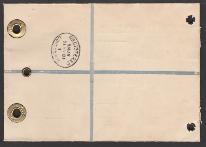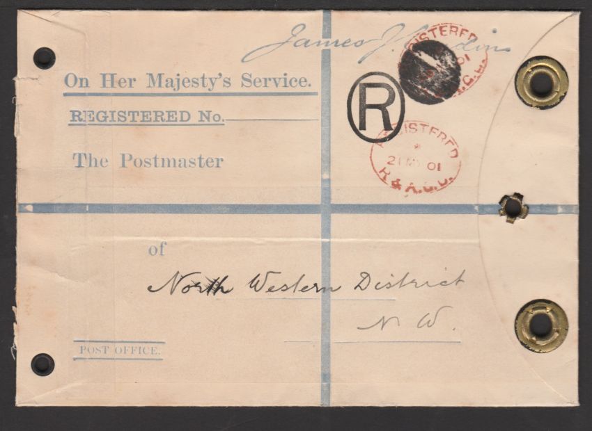 1901 Post Office Official Registered Envelope date stamped by red "REGISTERED / 20 MY 01 / R & A. G. D.", cancelled by a black dumb obliterator, and replaced by a similar registered date stamp for 21st May.