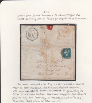 Entire letter (some staining) from London to "Mr R. Moffat, Revd J.C. Bruces, Percy St, Newcastle on Tyne" franked 2d, written by James Vavasseur (the son-in-law of Robert Moffat of Kuruman) to his brother-in-law Robert.  Vavasseur reports his wife Helen's refusal to allow him to proceed to South Africa as a missionary or colonist, and encloses a letter (no longer present) from Mrs Moffat in Kuruman.  An interesting item relating to the early missionary history of Bechuanaland.