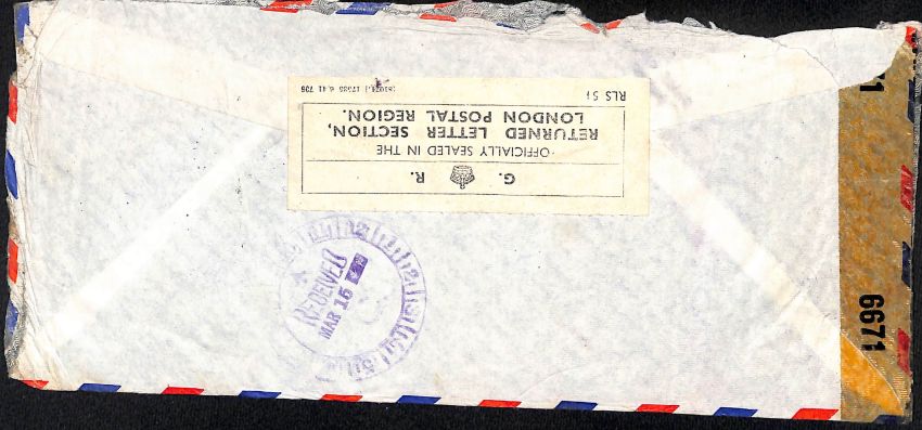 Cover from New York to London, water damaged and handstamped "DAMAGED BY SEA WATER".  Reverse with British Officially Sealed label.