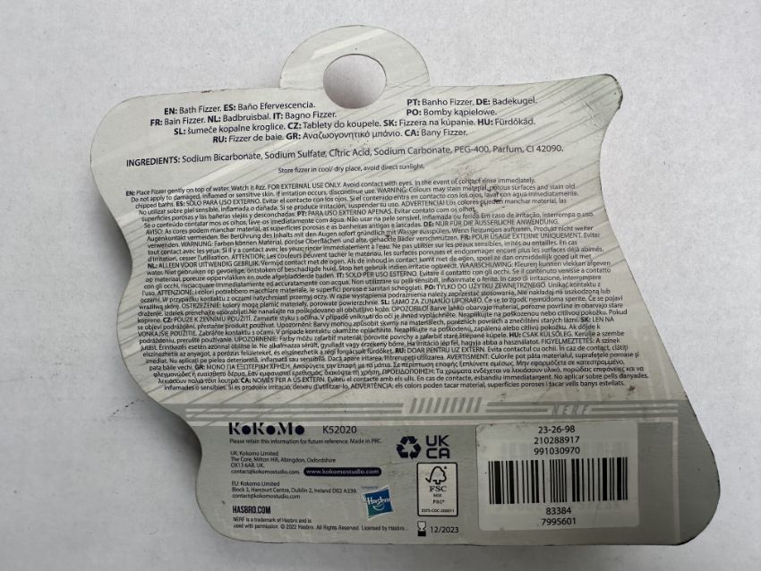 Nerf bath fizzer - ​add the fizzer to the bath water and it will start fizzing and change the colour of the water. Qty (pcs/pallet) - 1,152 - RRP (Per item) - 2.00 - Total RRP. - £2,304