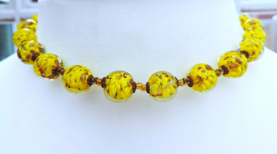 The necklace has a screw clasp, the beads are clear with vibrant swirls of yellow infused with gold Aventurine.