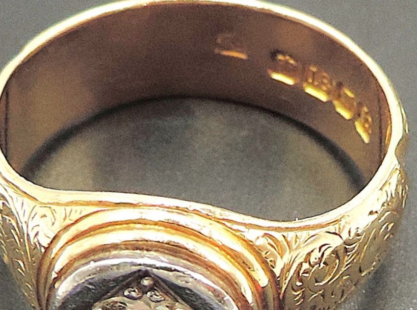 Hallmarks: 18 (18 carat gold), crown for London assay, date letter ‘h’ for 1903 and makers marks.