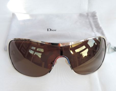 Frame: gold tone with beige temples and brown mirrored lenses.