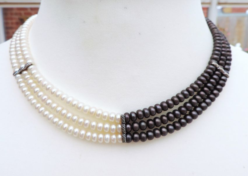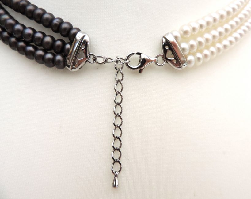 The necklace is 18 inches long, silver clasp with chain which can adjust up to 19.25 inches wearable length. There are 5 silver separation bars which hold the pearls together and allows the necklace to lay perfectly on the neck.