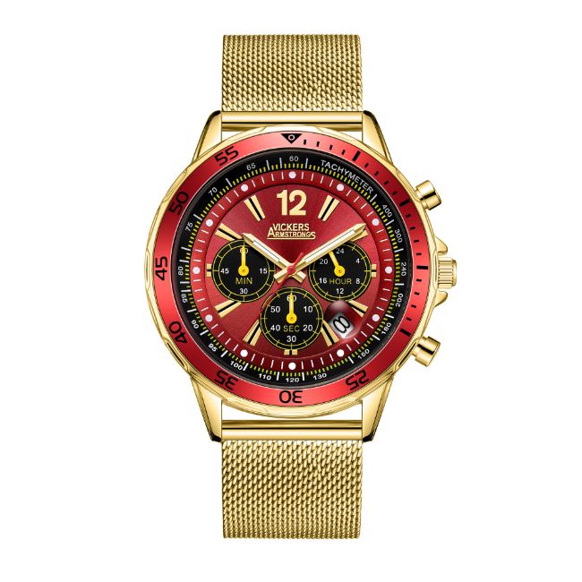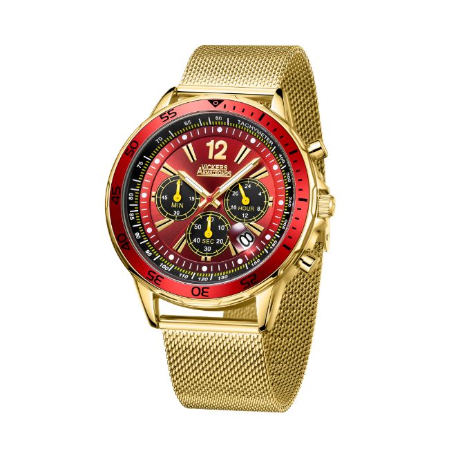The Vickers Armstrong's Limited Edition Hand Assembled Mugford Chopper in Gold Red men’s watch pays tribute to the members of this squadron who used Vickers machine guns attached to motorcycles to repel enemy forces on the Western Front.