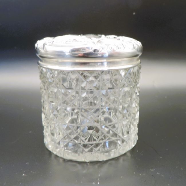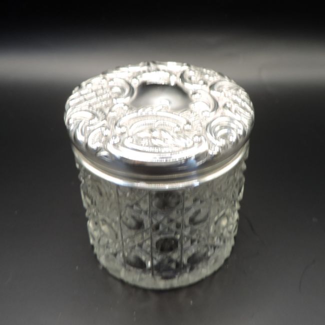 A lovely jar and a good heavy weight in great antique condition with no chips to the cut glass or dents to the silver.