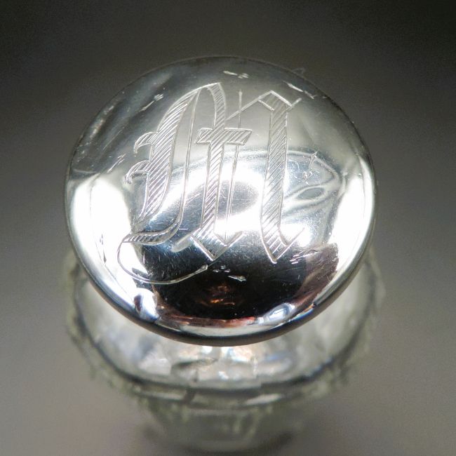 The silver lid is engraved with the initial M and the bottle is 10cm high and 4cm wide.