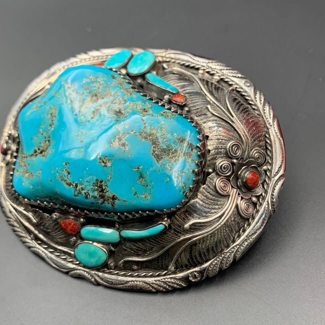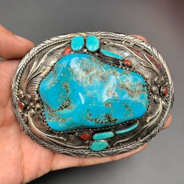 Title: Handmade Natural Turquoise, Coral With 925 Silver Belt Buckle, Best Quality