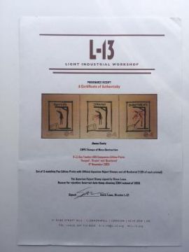 James Cauty has now been publishing works through the L-13 in it's three previous guises ('The Aquarium', 'The Aquarium L-13' and the 'L-13 Light Industrial Workshop') for 19 years since the first Blacksmoke Stamps of Mass Destruction 'Gas Mask Queen' pieces.