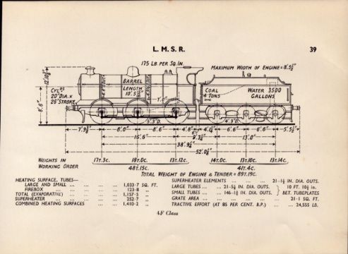 L.M.S.R. 4F Class Locomotive Detailed Drawing Diagram 85-Year-Old Print.