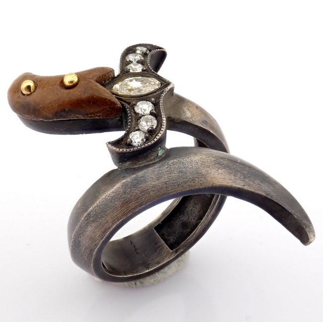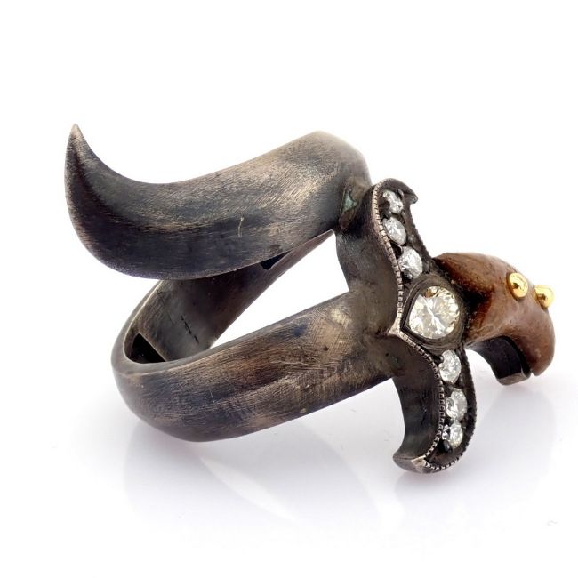An exquisite sword ring detailed with ebony, brilliant diamonds and gold on silver.