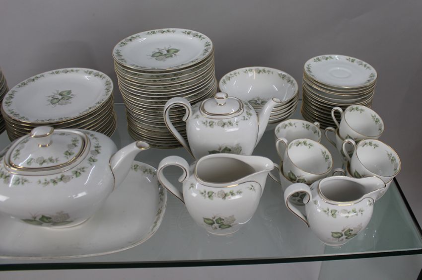 All pieces pictured, 108 pieces in total; 15x 10 3/4 inch dinner plates, 15x 8 inch salad plates, 12x 7 1/2 inch dessert plates, 24x 7 inch side plates, 6x 6 inch cereal bowls, sauce boat on stand, 2x lidded vegetable tureens, 1x vegetable tureen base, lidded tea pot, lidded coffee pot,16x tea saucers, 7x tea cups, cream jug, milk jug & 1x 9 1/2 inch cake plate