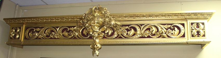 Carved wood composition with true gold leaf gilded finish.
