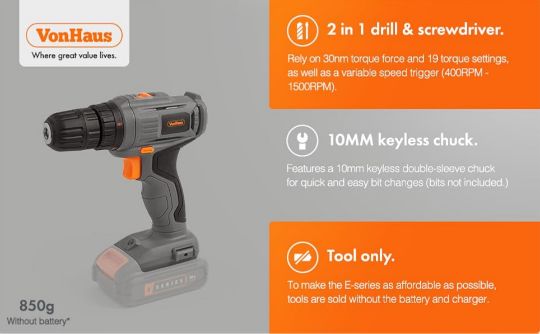 - 2-IN-1 DRILL & DRIVER – 2 speed drill with speed selector. (400/1500RPM). Drilling capacity of 10mm into metal and 20mm into wood. Features a 10mm keyless double sleeve chuck and can accommodate drill bits (not included) up to 10mm. 30Nm torque force & 19 settings