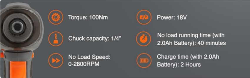 - Cordless – boasts a huge torque force of 100NM with speeds up to 2800RPM and an impact rate of up to 300IPM (suitable for outdoor & indoor use)