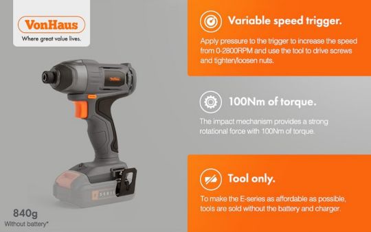 - E-Series – this tool is compatible with the battery and charger in the VonHaus E-series Cordless range (battery and charger sold separately)