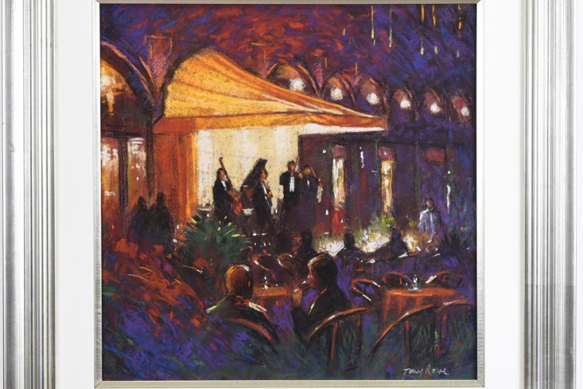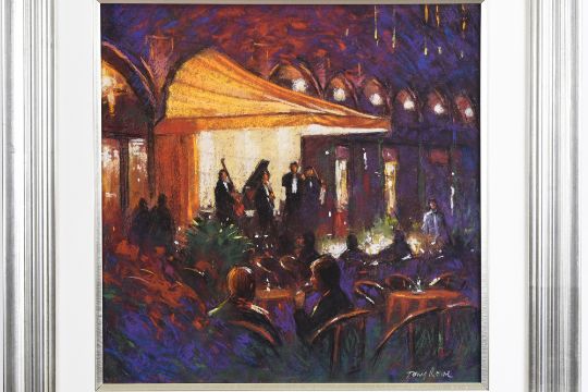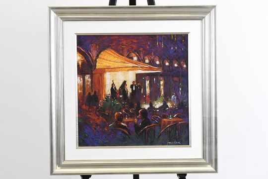 This colourful painting is titled "The Cafe Quartet" Supplied with a replacement valuation for £2000 along with a certificate of authenticity and biographical details on the artist. (Free of charge).