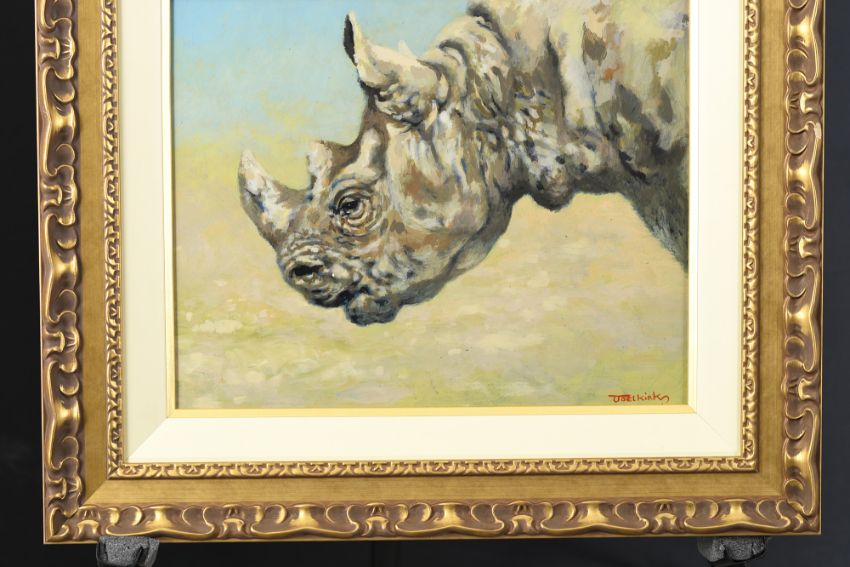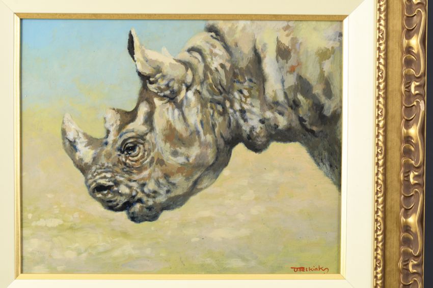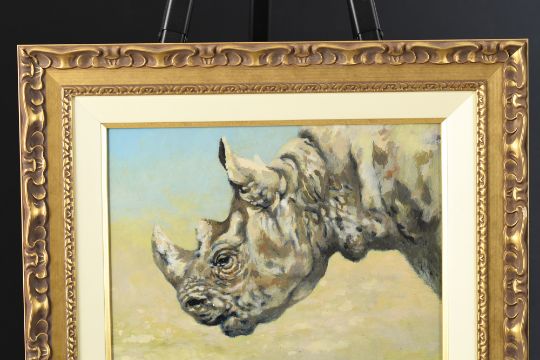 4529 - A rare opportunity to obtain an original oil on panel of a White Rhino by the late and much loved English artist Joel Kirk (1948-2020).