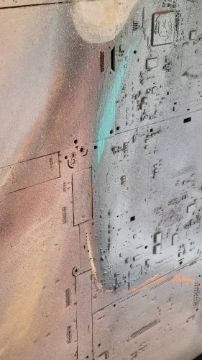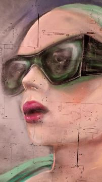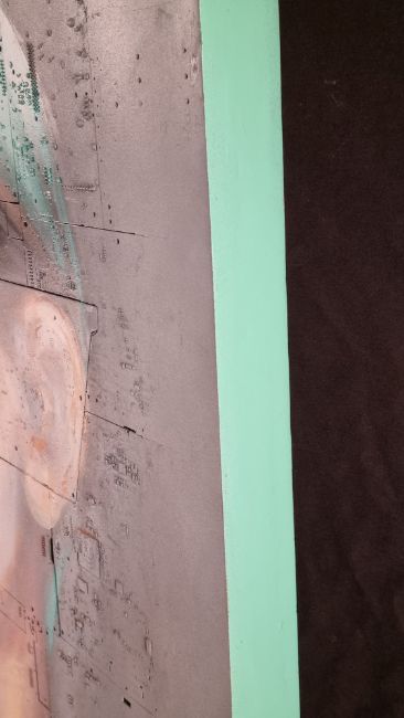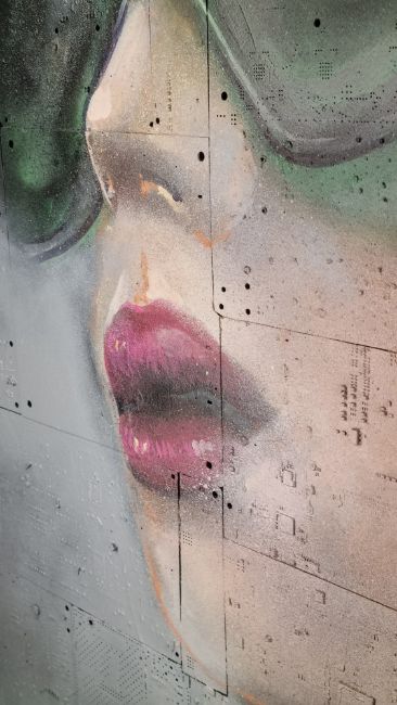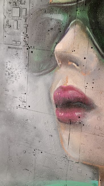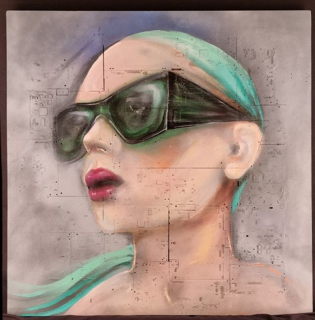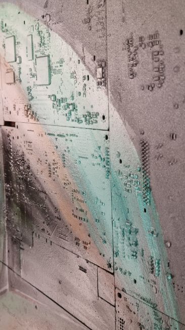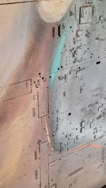 Made eniterly from circuit board layed into wood then painted with acrylic, oil and spray.
