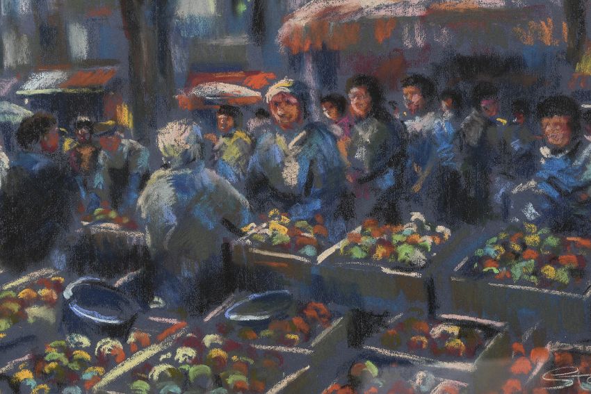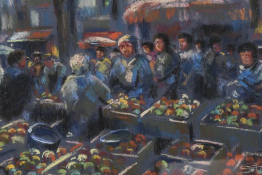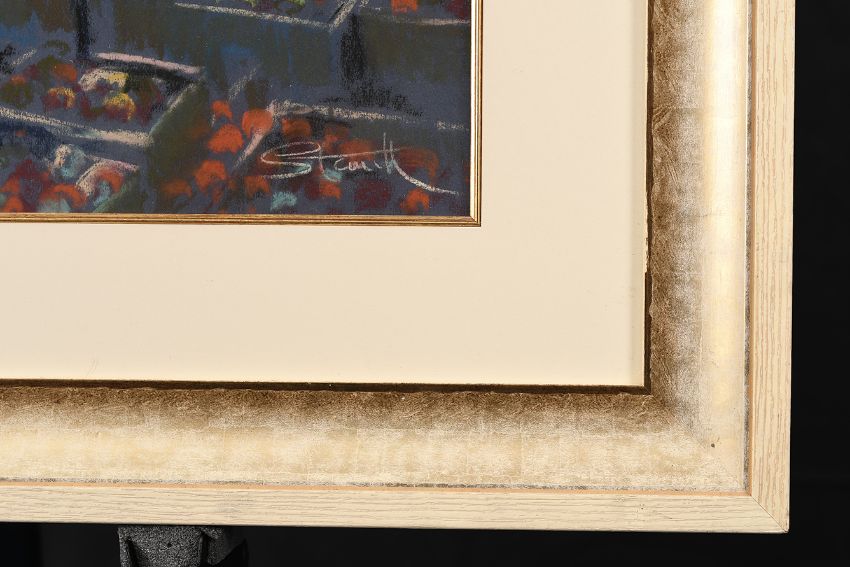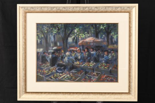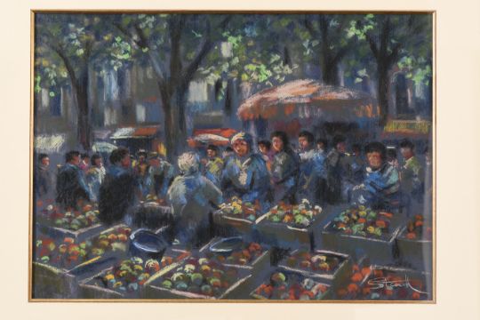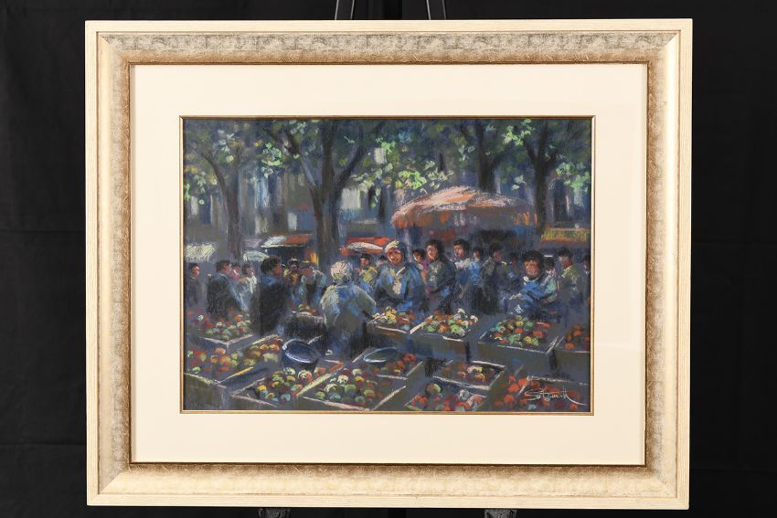1658 - A delightful original pastel by the artist Stanik (aka Joel Kirk 1948 - 2020) this colourful French market scene has been very nicely framed and mounted.