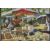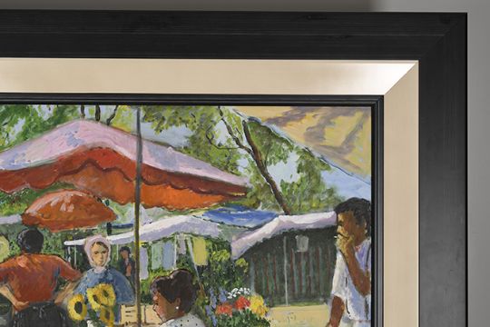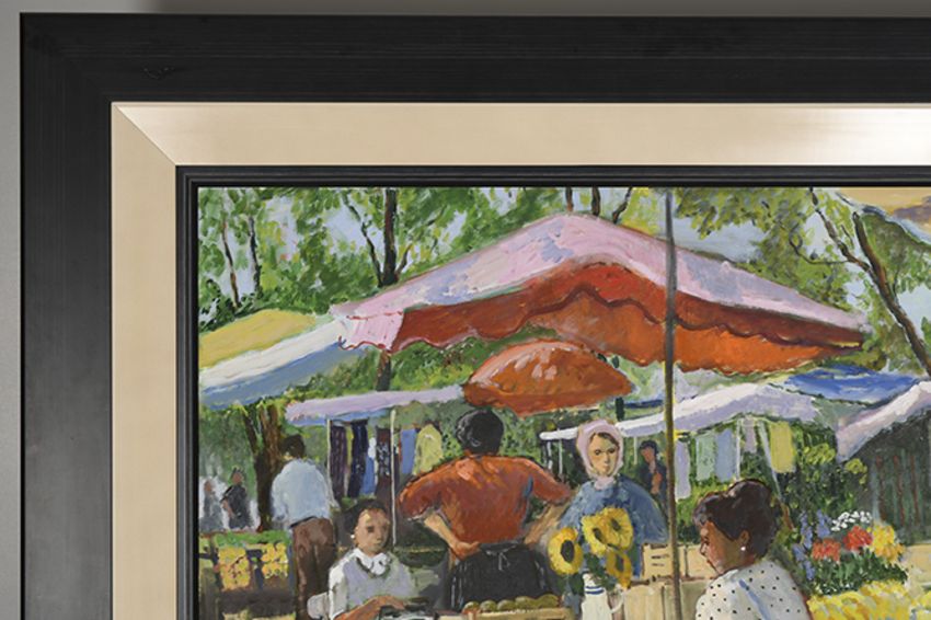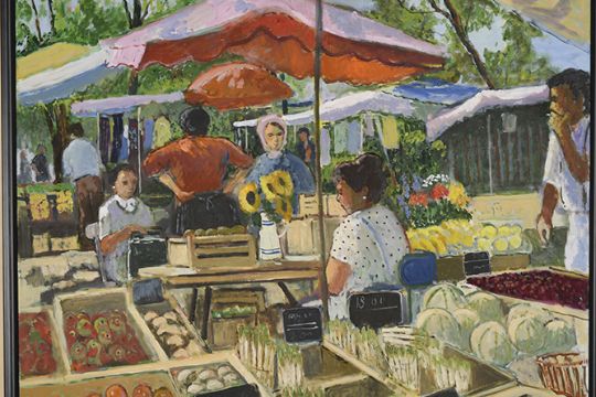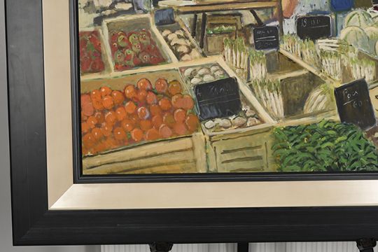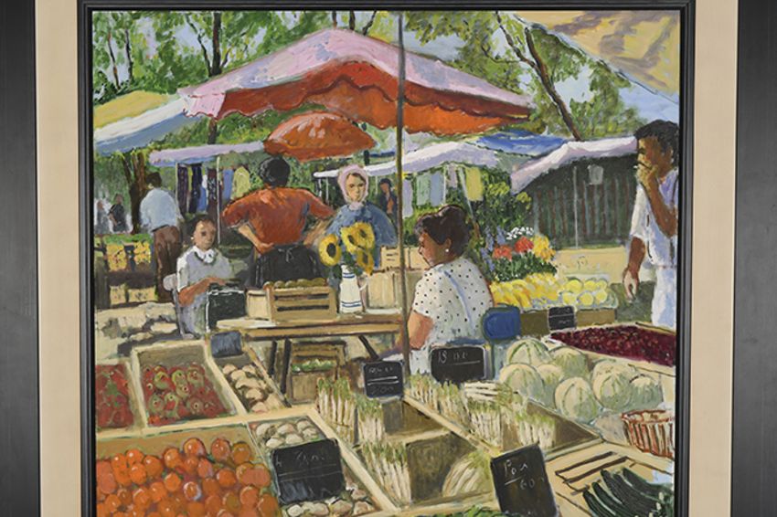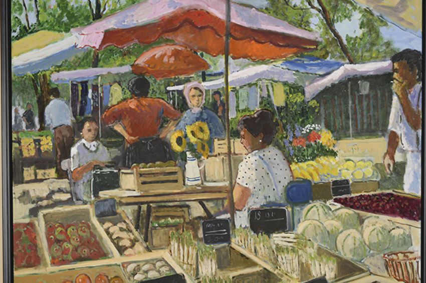 Depiction of a French fruit market with the colours and style that are synonymous with John Ash's style.