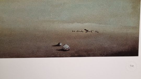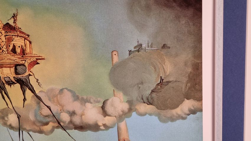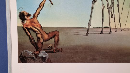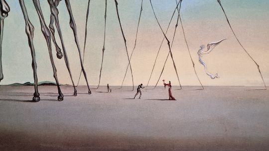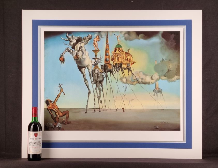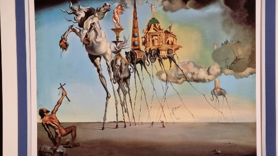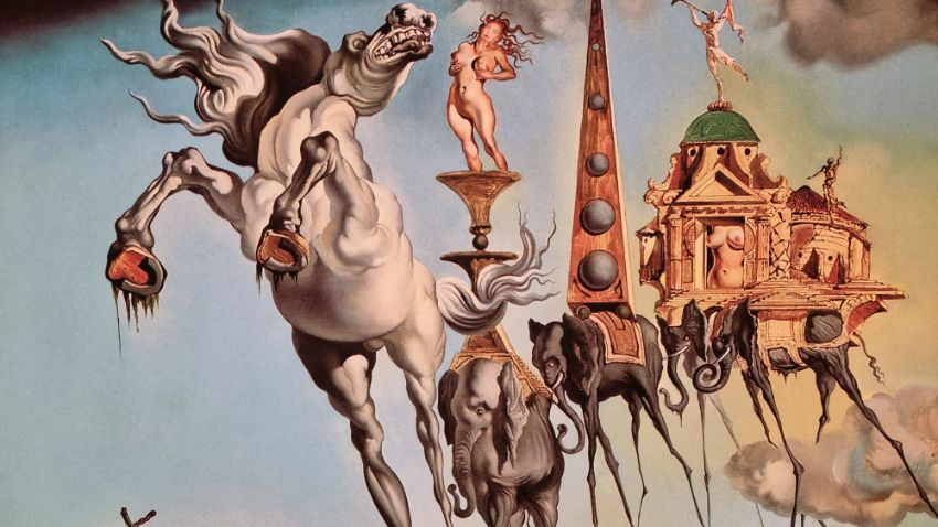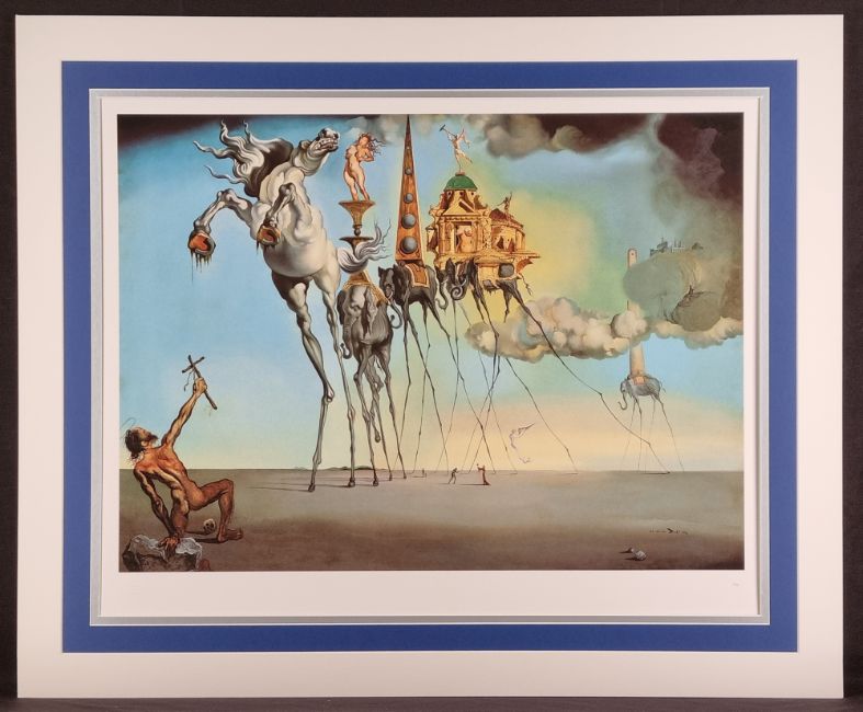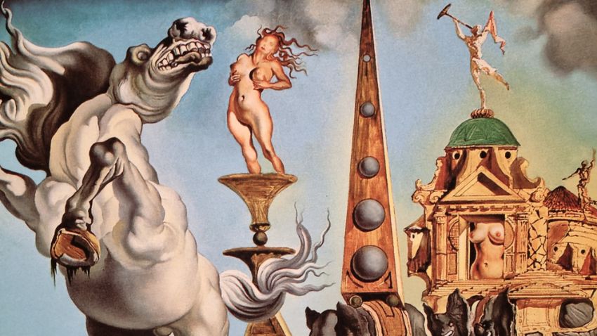 In this picture Temptation appears to Saint Anthony successively in the form of a horse in the foreground representing strength, sometimes also the symbol of voluptuousness, and in the form of the elephant which follows it, carrying on its back the golden cup of lust in which a nude woman is standing precariously balanced on the fragile pedestal, a figure which emphasizes the erotic character of the composition. The other elephants are carrying buildings on their back; the first of these is an obelisk inspired by that of Bernini in Rome, the second and third are Venetian edifices in the style of Paladio. In the background another elephant carries a tall tower which is not without phallic overtones and in the clouds one can glimpse a few fragments of the Escorial, symbol of temporal and spiritual order. This painting was painted in the studio that the artist occupied for a few days next to the Colony Restaurant in New York. It is the first and the only time that he participated in a contest. It was an invitational artistic competition for a painting on the theme of the temptation of Saint Anthony, organized in 1946 by the Loew Lewin Company, a movie-producing firm. The winning picture was to figure in a film taken from the story "Bel Ami" by Maupassant. Eleven painters took part in the competition, among them Dali, Paul Delaux, Max Ernst. The prize was given to Max Ernst.